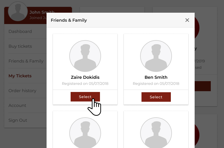 To manage your friends and family and send them gifts, you will need to log in to your account through the Falcon website. In order to gift your tickets you’ll need to add some friends from the account dashboard. Choose “Friends & Family”.